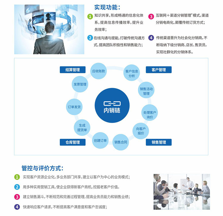 系統(tǒng)特色:實(shí)現(xiàn)360度全面了解客戶,通過客戶視圖不僅可以了解客戶的基本信息、聯(lián)系信息,了解客戶的業(yè)務(wù)往來信息,對(duì)銷售機(jī)會(huì)進(jìn)行精確分析,甄別有價(jià)值客戶,從而加強(qiáng)跟單過程控制,提升簽約率。另外銷售跟進(jìn)與操作評(píng)價(jià),有助于銷售團(tuán)隊(duì)的能力提升和潛能挖掘。