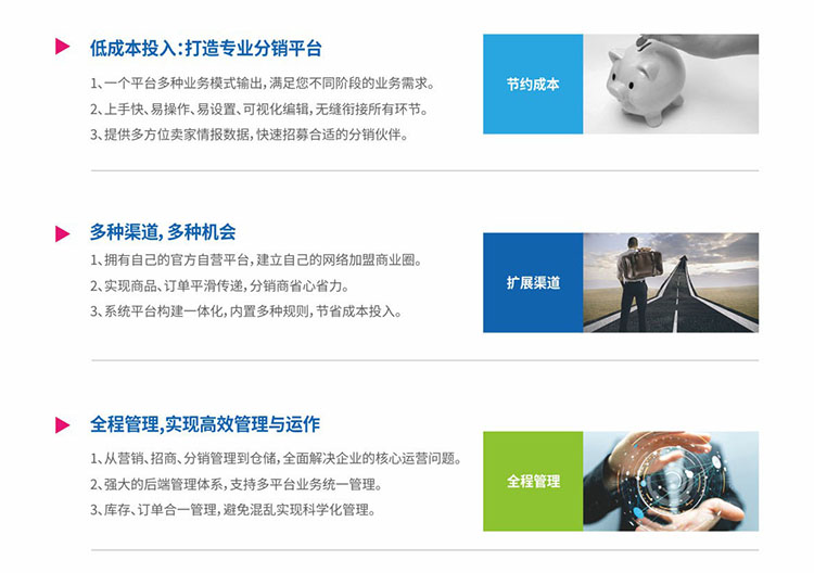 國內(nèi)營銷戰(zhàn)略涵蓋:分銷渠道管理、級(jí)別限制、促銷與返利、虛擬庫存、訂單管理(審核、驗(yàn)貨、發(fā)貨、退換貨)、吞吐量分析、帳務(wù)管理、流水管理、對(duì)帳管理等。