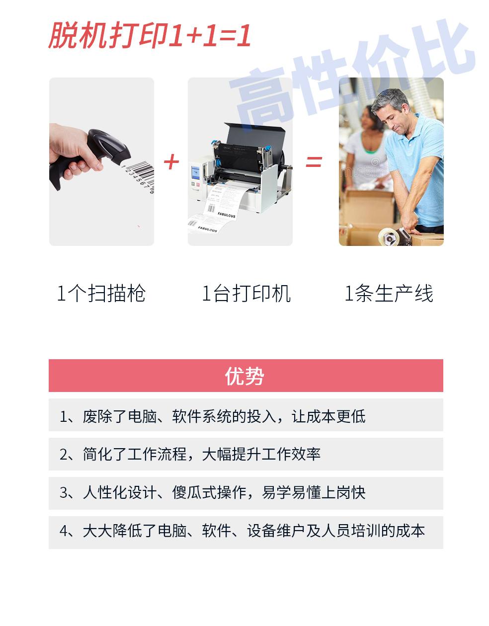 1.節省空間、低功耗。 2.外觀緊湊美觀,小巧輕便,可隨時隨地使用。 3.可獨立工作,脫開電腦和軟件的控制,編輯打印可在幾秒內完成。 4.外部接口豐富,應用廣泛。如:自動化流水線、手機制作行業、物流行業、應用終端行業、制衣行業等等。
